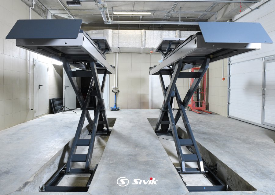 - ПГН-8350 оснащен встроенным в платформы ножничным подъемником второго уровня для вывешивания колес автомобиля